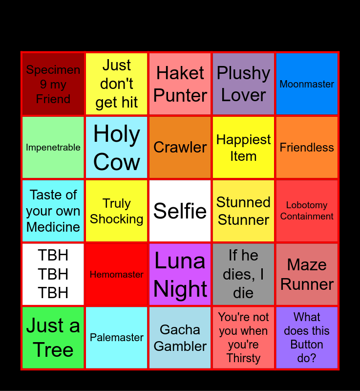 This bingo card has a free space and 24 words: Hemomaster, Palemaster, Crawler, Just a Tree, Moonmaster, Specimen 9 my Friend, Impenetrable, Just don't get hit, Stunned Stunner, Luna Night, Happiest Item, Taste of your own Medicine, If he dies, I die, Maze Runner, Holy Cow, You're not you when you're Thirsty, Lobotomy Containment, Haket Punter, Friendless, Truly Shocking, What does this Button do?, TBH TBH TBH, Plushy Lover and Gacha Gambler.