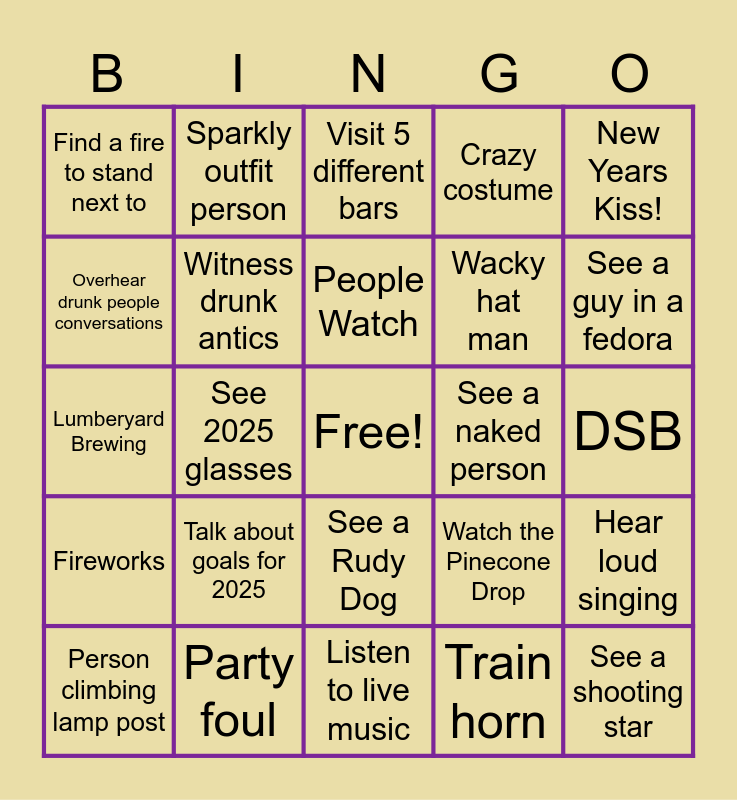 This bingo card has a free space and 24 words: Talk about goals for 2025, Party foul, People Watch, Person climbing lamp post, New Years Kiss!, Find a fire to stand next to, Overhear drunk people conversations, Sparkly outfit person, See a naked person, See a Rudy Dog, Wacky hat man, Lumberyard Brewing, Watch the Pinecone Drop, Hear loud singing, Witness drunk antics, Train horn, DSB, Visit 5 different bars, See a guy in a fedora, See 2025 glasses, See a shooting star, Fireworks, Crazy costume and Listen to live music.