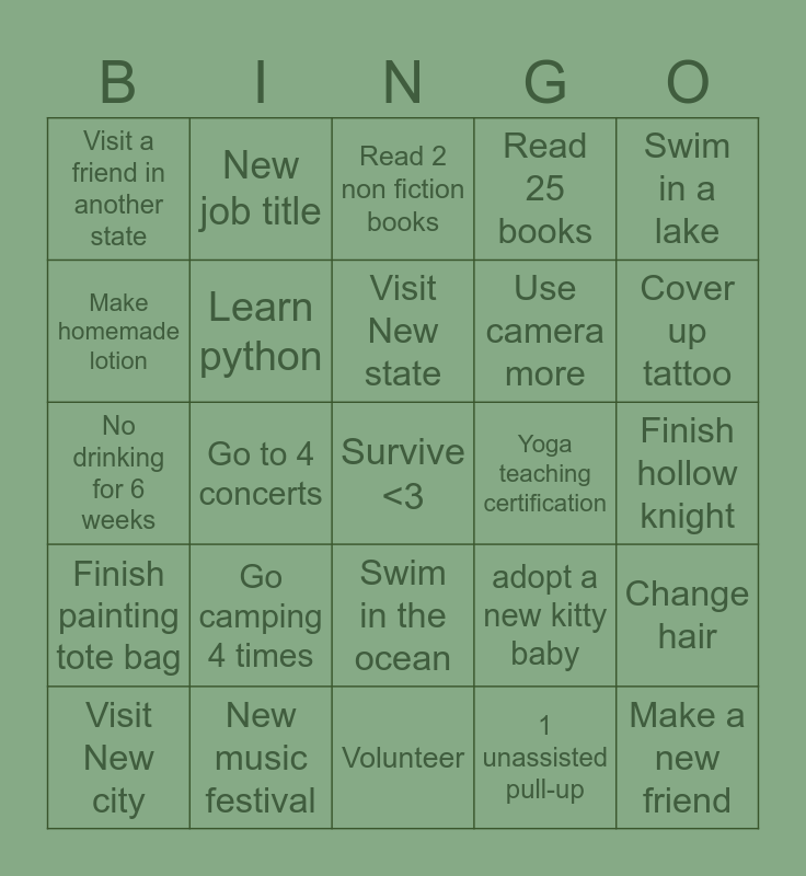 This bingo card has a free space and 24 words: Go camping 4 times, New music festival, Visit New state, Visit New city, Swim in a lake, Visit a friend in another state, Make homemade lotion, New job title, Yoga teaching certification, Swim in the ocean, Use camera more, No drinking for 6 weeks, adopt a new kitty baby, Change hair, Learn python, 1 unassisted pull-up, Finish hollow knight, Read 2 non fiction books, Cover up tattoo, Go to 4 concerts, Make a new friend, Finish painting tote bag, Read 25 books and Volunteer.