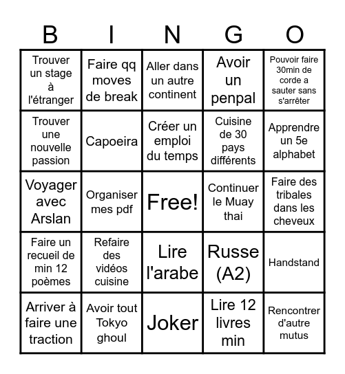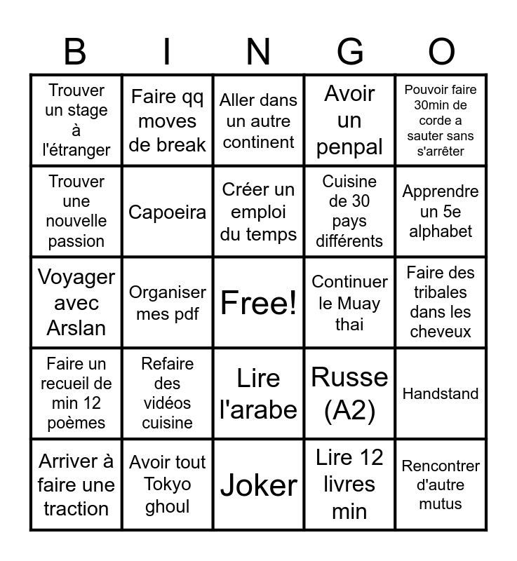 This bingo card has a free space and 24 words: Refaire des vidéos cuisine, Avoir tout Tokyo ghoul, Créer un emploi du temps, Arriver à faire une traction, Pouvoir faire 30min de corde a sauter sans s'arrêter, Trouver un stage à l'étranger, Trouver une nouvelle passion, Faire qq moves de break, Continuer le Muay thai, Lire l'arabe, Cuisine de 30 pays différents, Voyager avec Arslan, Russe (A2), Handstand, Capoeira, Lire 12 livres min, Faire des tribales dans les cheveux, Aller dans un autre continent, Apprendre un 5e alphabet, Organiser mes pdf, Rencontrer d'autre mutus, Faire un recueil de min 12 poèmes, Avoir un penpal and Joker.