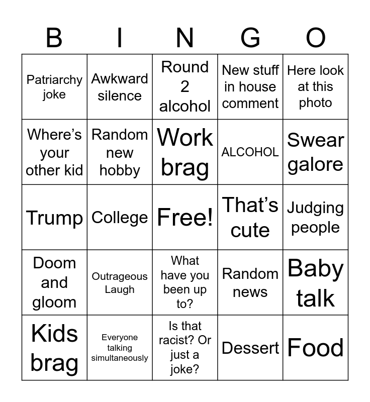 This bingo card has a free space and 24 words: Outrageous Laugh, Everyone talking simultaneously, Work brag, Kids brag, Here look at this photo, Patriarchy joke, Where’s your other kid, Awkward silence, That’s cute, What have you been up to?, ALCOHOL, Trump, Random news, Baby talk, Random new hobby, Dessert, Judging people, Round 2 alcohol, Swear galore, College, Food, Doom and gloom, New stuff in house comment and Is that racist? Or just a joke?.