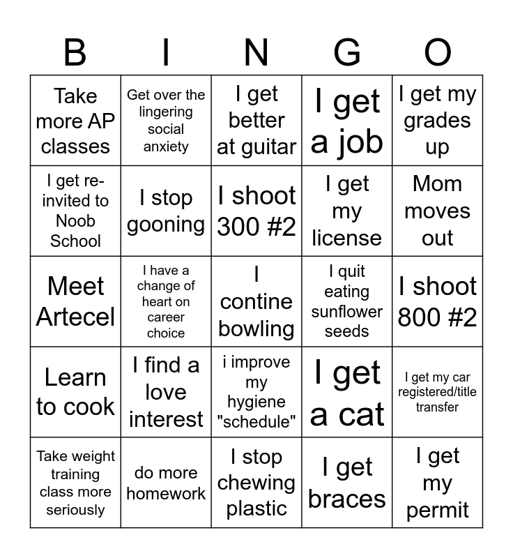 This bingo card has a free space and 24 words: I find a love interest, do more homework, I shoot 300 #2, Take weight training class more seriously, I get my grades up, Take more AP classes, I get re-invited to Noob School, Get over the lingering social anxiety, I quit eating sunflower seeds, i improve my hygiene "schedule", I get my license, Meet Artecel, I get a cat, I get my car registered/title transfer, I stop gooning, I get braces, I shoot 800 #2, I get better at guitar, Mom moves out, I have a change of heart on career choice, I get my permit, Learn to cook, I get a job and I stop chewing plastic.