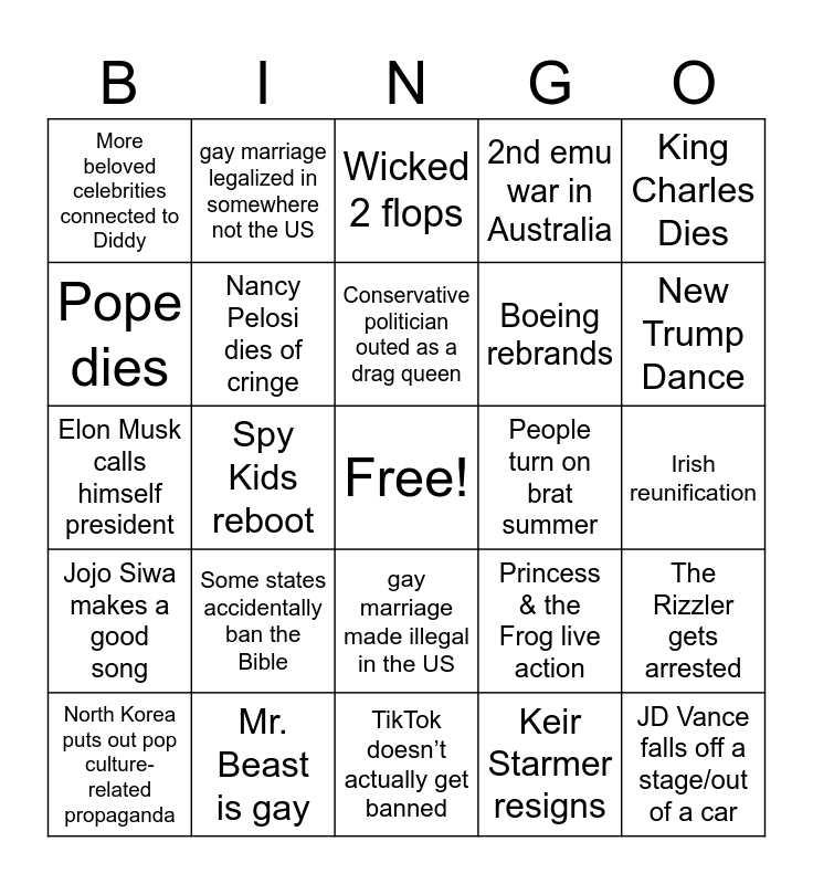 This bingo card has a free space and 24 words: Some states accidentally ban the Bible, Mr. Beast is gay, Conservative politician outed as a drag queen, North Korea puts out pop culture-related propaganda, King Charles Dies, More beloved celebrities connected to Diddy, Pope dies, gay marriage legalized in somewhere not the US, People turn on brat summer, gay marriage made illegal in the US, Boeing rebrands, Elon Musk calls himself president, Princess & the Frog live action, The Rizzler gets arrested, Nancy Pelosi dies of cringe, Keir Starmer resigns, Irish reunification, Wicked 2 flops, New Trump Dance, Spy Kids reboot, JD Vance falls off a stage/out of a car, Jojo Siwa makes a good song, 2nd emu war in Australia and TikTok doesn’t actually get banned.