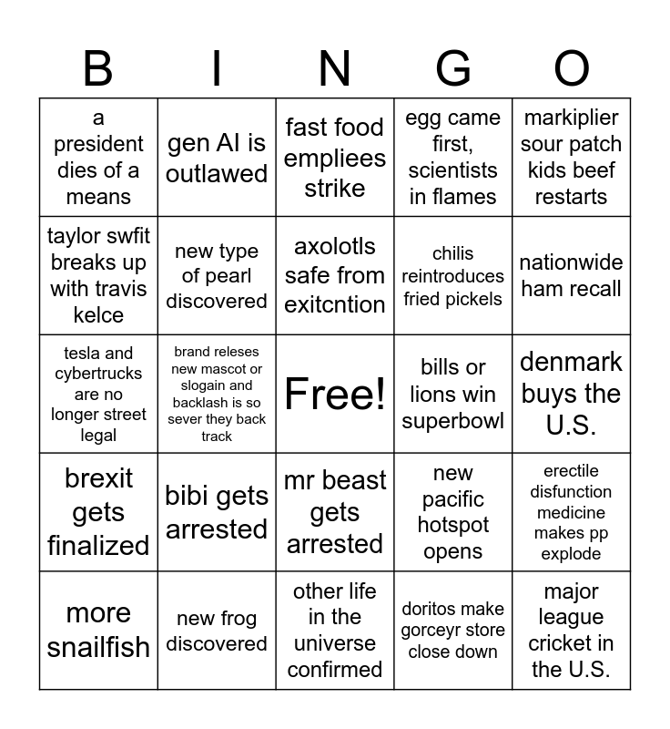 This bingo card has a free space and 24 words: bibi gets arrested, new frog discovered, axolotls safe from exitcntion, more snailfish, markiplier sour patch kids beef restarts, a president dies of a means, taylor swfit breaks up with travis kelce, gen AI is outlawed, bills or lions win superbowl, mr beast gets arrested, chilis reintroduces fried pickels, tesla and cybertrucks are no longer street legal, new pacific hotspot opens, erectile disfunction medicine makes pp explode, new type of pearl discovered, doritos make gorceyr store close down, denmark buys the U.S., fast food empliees strike, nationwide ham recall, brand releses new mascot or slogain and backlash is so sever they back track, major league cricket in the U.S., brexit gets finalized, egg came first, scientists in flames and other life in the universe confirmed.