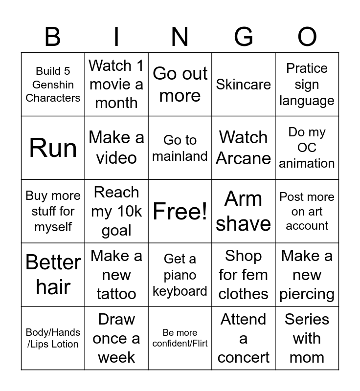 This bingo card has a free space and 24 words: Make a new tattoo, Draw once a week, Go to mainland, Body/Hands /Lips Lotion, Pratice sign language, Build 5 Genshin Characters, Run, Watch 1 movie a month, Arm shave, Get a piano keyboard, Watch Arcane, Buy more stuff for myself, Shop for fem clothes, Make a new piercing, Make a video, Attend a concert, Post more on art account, Go out more, Do my OC animation, Reach my 10k goal, Series with mom, Better hair, Skincare and Be more confident/Flirt.