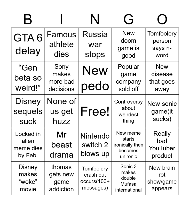 This bingo card has a free space and 24 words: Mr beast drama, thomas gets new game addiction, New pedo, Disney makes “woke” movie, Tomfoolery person says n-word, GTA 6 delay, “Gen beta so weird!”, Famous athlete dies, Controversy about weirdest thing, Nintendo switch 2 blows up, Popular game company sold off, Disney sequels suck, New meme starts ironically then becomes unironic, Really bad YouTuber product, Sony makes more bad decisions, Sonic 3 makes double Mufasa international, New sonic game(it sucks), Russia war stops, New disease that goes away, None of us get huzz, New brain rot show/game appears, Locked in alien meme dies by Feb., New doom game is good and Tomfoolery crash out occurs(100+ messages).