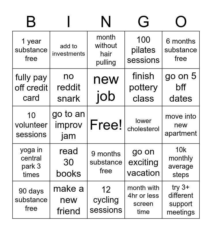 This bingo card has a free space and 24 words: read 30 books, make a new friend, new job, 90 days substance free, 6 months substance free, 1 year substance free, fully pay off credit card, add to investments, lower cholesterol, 9 months substance free, finish pottery class, 10 volunteer sessions, go on exciting vacation, 10k monthly average steps, no reddit snark, month with 4hr or less screen time, move into new apartment, month without hair pulling, go on 5 bff dates, go to an improv jam, try 3+ different support meetings, yoga in central park 3 times, 100 pilates sessions and 12 cycling sessions.