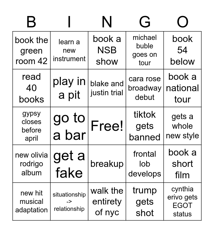 This bingo card has a free space and 24 words: get a fake, situationship -> relationship, blake and justin trial, new hit musical adaptation, book 54 below, book the green room 42, read 40 books, learn a new instrument, tiktok gets banned, breakup, cara rose broadway debut, gypsy closes before april, frontal lob develops, book a short film, play in a pit, trump gets shot, gets a whole new style, book a NSB show, book a national tour, go to a bar, cynthia erivo gets EGOT status, new olivia rodrigo album, michael buble goes on tour and walk the entirety of nyc.