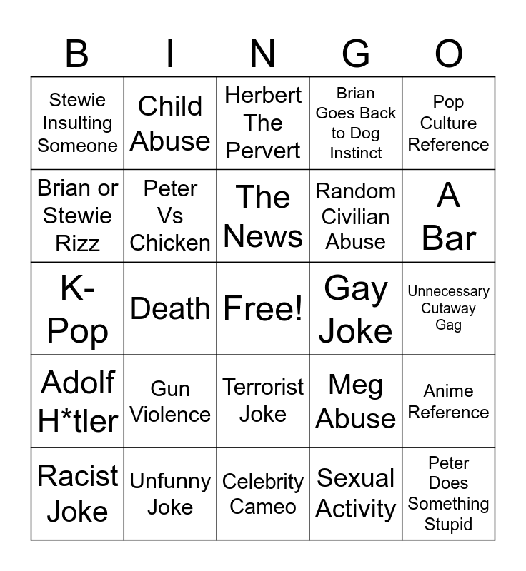 This bingo card has a free space and 29 words: Racist Joke, Quagmire says Giggity, Death, Joe (Momma) Falls, Stewie Insulting Someone, Herbert The Pervert, Peter Vs Chicken, Gun Violence, Gay Joke, Unfunny Joke, Unnecessary Cutaway Gag, Peter Does Something Stupid, Celebrity Cameo, Sexual Activity, A Bar, Someone Is Drunk, Terrorist Joke, Adolf H*tler, Pop Culture Reference, K-Pop, Meg Abuse, Crippled Abuse, Random Civilian Abuse, Brian or Stewie Rizz, Brian Goes Back to Dog Instinct, Child Abuse, Anime Reference, The News and Peter Buff.