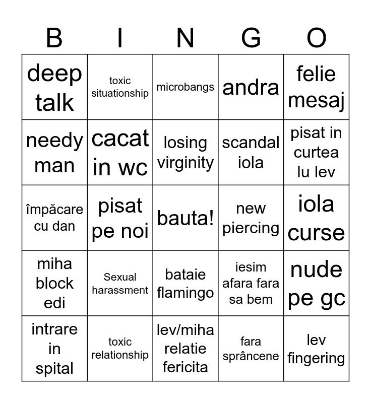 This bingo card has a free space and 24 words: Sexual harassment, toxic relationship, losing virginity, intrare in spital, felie mesaj, deep talk, needy man, toxic situationship, new piercing, bataie flamingo, scandal iola, împăcare cu dan, iesim afara fara sa bem, nude pe gc, cacat in wc, fara sprâncene, iola curse, microbangs, pisat in curtea lu lev, pisat pe noi, lev fingering, miha block edi, andra and lev/miha relatie fericita.