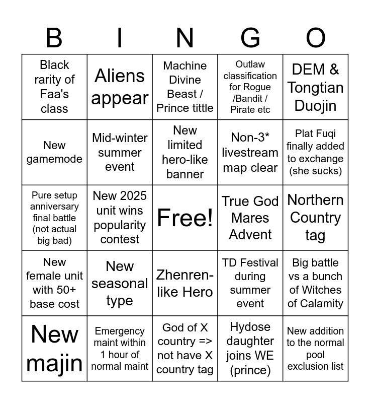 This bingo card has a free space and 24 words: New seasonal type, Emergency maint within 1 hour of normal maint, New limited hero-like banner, New majin, DEM & Tongtian Duojin, Black rarity of Faa's class, New gamemode, Aliens appear, True God Mares Advent, Zhenren-like Hero, Non-3* livestream map clear, Pure setup anniversary final battle (not actual big bad), TD Festival during summer event, Big battle vs a bunch of Witches of Calamity, Mid-winter summer event, Hydose daughter joins WE (prince), Northern Country tag, Machine Divine Beast / Prince tittle, Plat Fuqi finally added to exchange (she sucks), New 2025 unit wins popularity contest, New addition to the normal pool exclusion list, New female unit with 50+ base cost, Outlaw classification for Rogue /Bandit / Pirate etc and God of X country => not have X country tag.