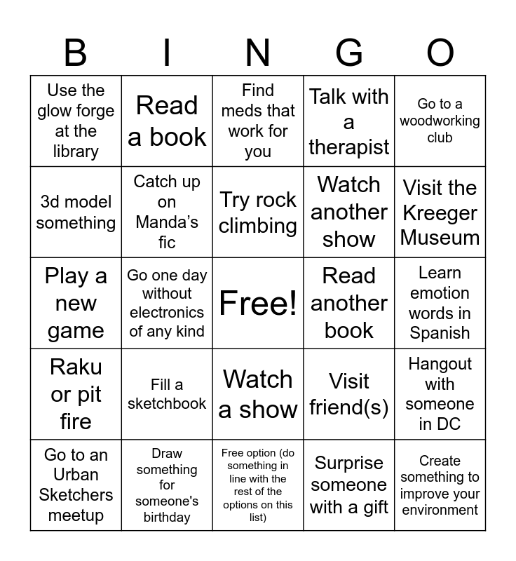 This bingo card has a free space and 24 words: Fill a sketchbook, Draw something for someone's birthday, Try rock climbing, Go to an Urban Sketchers meetup, Go to a woodworking club, Use the glow forge at the library, 3d model something, Read a book, Read another book, Watch a show, Watch another show, Play a new game, Visit friend(s), Hangout with someone in DC, Catch up on Manda’s fic, Surprise someone with a gift, Learn emotion words in Spanish, Find meds that work for you, Visit the Kreeger Museum, Go one day without electronics of any kind, Create something to improve your environment, Raku or pit fire, Talk with a therapist and Free option (do something in line with the rest of the options on this list).