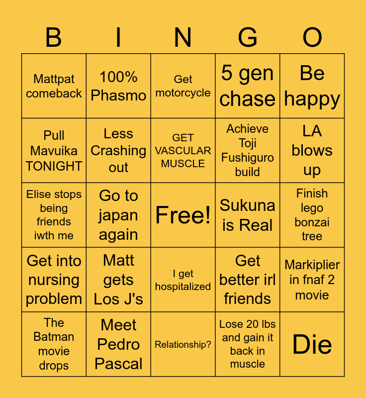 This bingo card has a free space and 24 words: Matt gets Los J's, Meet Pedro Pascal, GET VASCULAR MUSCLE, The Batman movie drops, Be happy, Mattpat comeback, Pull Mavuika TONIGHT, 100% Phasmo, Sukuna is Real, I get hospitalized, Achieve Toji Fushiguro build, Elise stops being friends iwth me, Get better irl friends, Markiplier in fnaf 2 movie, Less Crashing out, Lose 20 lbs and gain it back in muscle, Finish lego bonzai tree, Get motorcycle, LA blows up, Go to japan again, Die, Get into nursing problem, 5 gen chase and Relationship?.