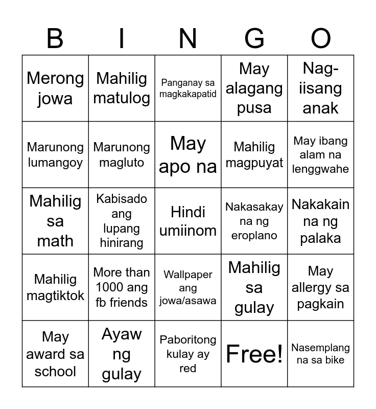 This bingo card has 30 words: Ayaw ng gulay, May alagang aso, Kabisado ang lupang hinirang, Mahilig sa Kdrama, Merong jowa, Panganay sa magkakapatid, Marunong magluto, Wallpaper ang jowa/asawa, Nakasakay na ng eroplano, Paboritong kulay ay red, Nakakain na ng palaka, Hindi umiinom, Free!, Nasemplang na sa bike, May ibang alam na lenggwahe, Middle child, Mahilig sa gulay, Mahilig magtiktok, More than 1000 ang fb friends, Nag-iisang anak, Mahilig sa math, Nagmahal, nasaktan, Mahilig matulog, Mahilig magpuyat, Marunong lumangoy, May alagang pusa, May allergy sa pagkain, May award sa school, May apo na and Pinanganak ng January.