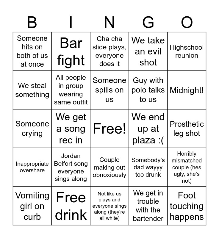 This bingo card has a free space and 24 words: Jordan Belfort song everyone sings along, Free drink, Someone spills on us, Vomiting girl on curb, Highschool reunion, Someone hits on both of us at once, We steal something, Bar fight, We end up at plaza :(, Couple making out obnoxiously, Guy with polo talks to us, Someone crying, Somebody’s dad wayyy too drunk, Horribly mismatched couple (hes ugly, she’s not), All people in group wearing same outfit, We get in trouble with the bartender, Prosthetic leg shot, Cha cha slide plays, everyone does it, Midnight!, We get a song rec in, Foot touching happens, Inappropriate overshare, We take an evil shot and Not like us plays and everyone sings along (they’re all white).