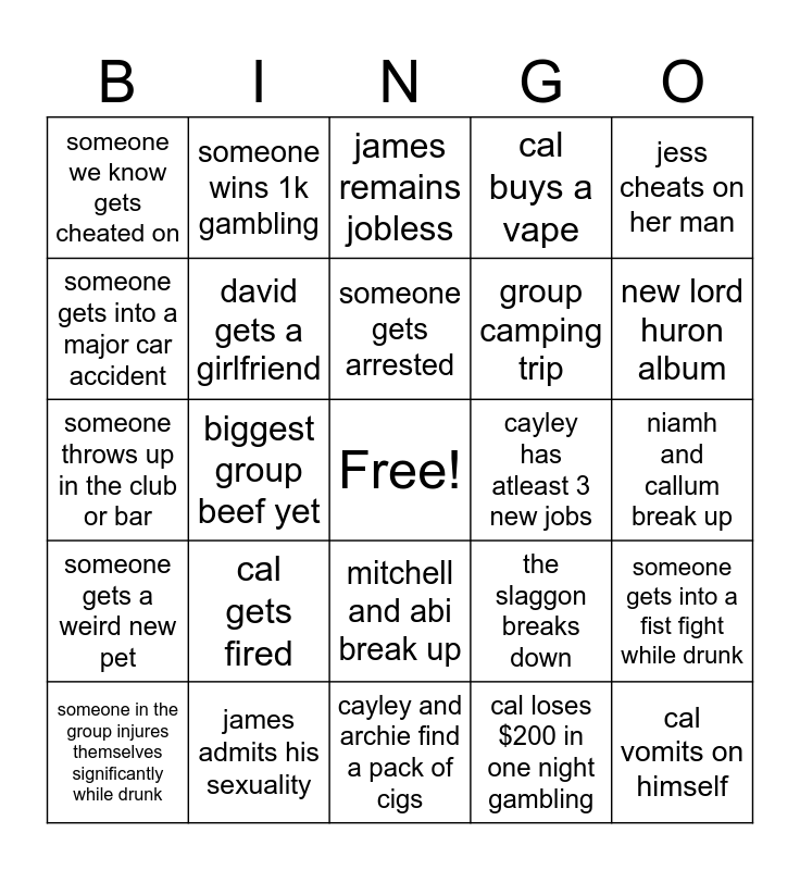 This bingo card has a free space and 24 words: someone in the group injures themselves significantly while drunk, cal gets fired, someone gets arrested, cal loses $200 in one night gambling, jess cheats on her man, someone we know gets cheated on, someone wins 1k gambling, james remains jobless, cayley has atleast 3 new jobs, niamh and callum break up, someone throws up in the club or bar, david gets a girlfriend, the slaggon breaks down, someone gets into a fist fight while drunk, someone gets into a major car accident, james admits his sexuality, cayley and archie find a pack of cigs, cal buys a vape, new lord huron album, someone gets a weird new pet, biggest group beef yet, mitchell and abi break up, group camping trip and cal vomits on himself.