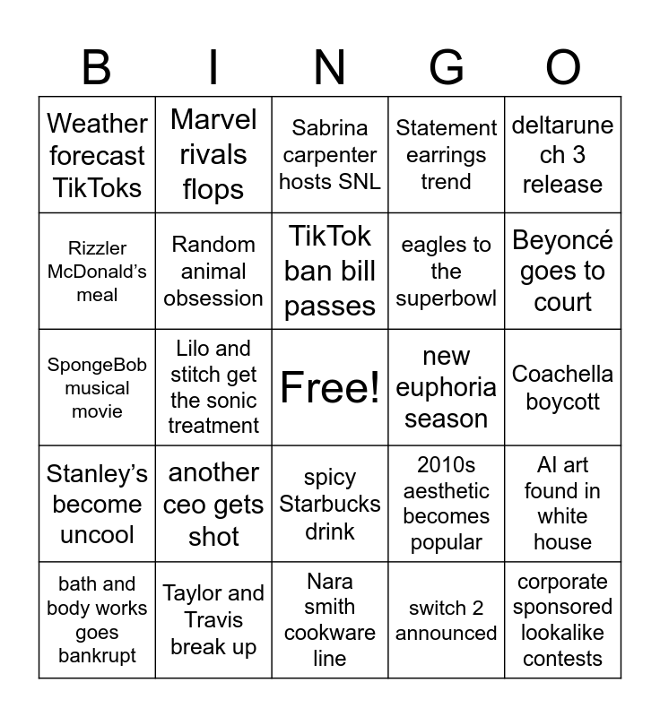 This bingo card has a free space and 24 words: another ceo gets shot, Taylor and Travis break up, TikTok ban bill passes, bath and body works goes bankrupt, deltarune ch 3 release, Weather forecast TikToks, Rizzler McDonald’s meal, Marvel rivals flops, new euphoria season, spicy Starbucks drink, eagles to the superbowl, SpongeBob musical movie, 2010s aesthetic becomes popular, AI art found in white house, Random animal obsession, switch 2 announced, Coachella boycott, Sabrina carpenter hosts SNL, Beyoncé goes to court, Lilo and stitch get the sonic treatment, corporate sponsored lookalike contests, Stanley’s become uncool, Statement earrings trend and Nara smith cookware line.