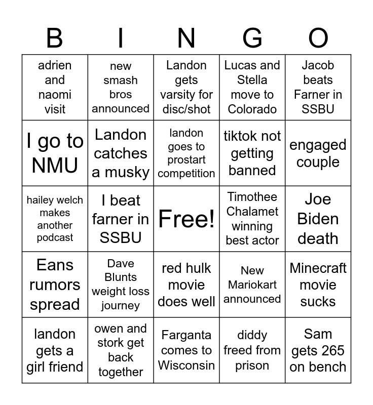 This bingo card has a free space and 24 words: Dave Blunts weight loss journey, owen and stork get back together, landon goes to prostart competition, landon gets a girl friend, Jacob beats Farner in SSBU, adrien and naomi visit, I go to NMU, new smash bros announced, Timothee Chalamet winning best actor, red hulk movie does well, tiktok not getting banned, hailey welch makes another podcast, New Mariokart announced, Minecraft movie sucks, Landon catches a musky, diddy freed from prison, Joe Biden death, Landon gets varsity for disc/shot, engaged couple, I beat farner in SSBU, Sam gets 265 on bench, Eans rumors spread, Lucas and Stella move to Colorado and Farganta comes to Wisconsin.