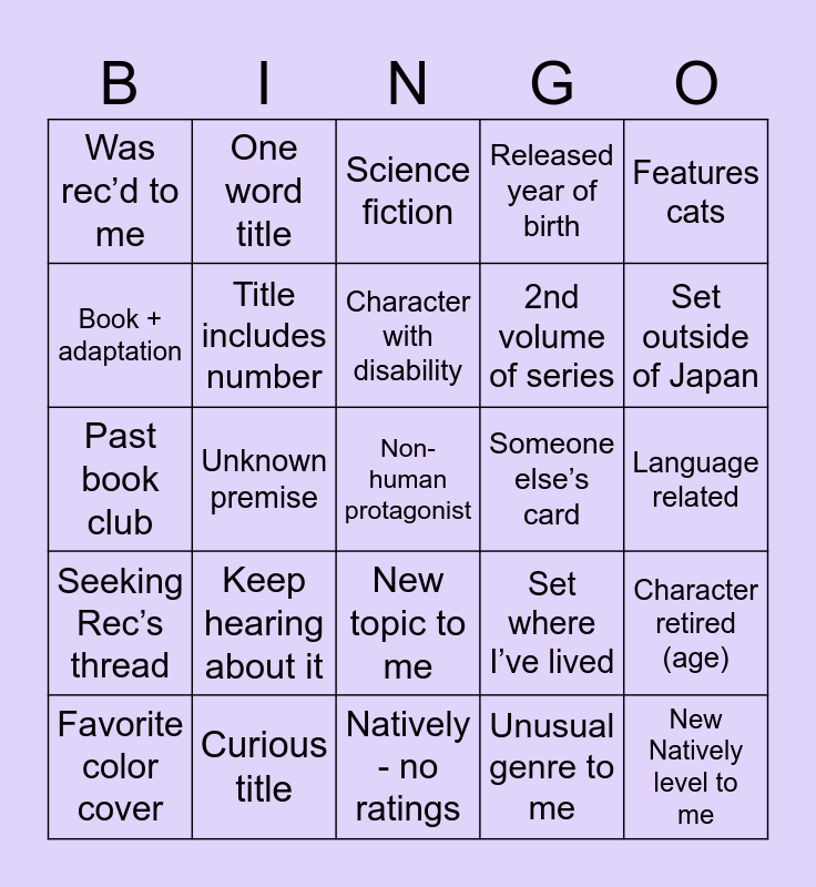 This bingo card has 25 words: Keep hearing about it, Natively - no ratings, Character with disability, Favorite color cover, Features cats, Was rec’d to me, Book + adaptation, One word title, Someone else’s card, New topic to me, 2nd volume of series, Past book club, Set where I’ve lived, Character retired (age), Title includes number, New Natively level to me, Language related, Science fiction, Set outside of Japan, Unknown premise, Non-human protagonist, Curious title, Seeking Rec’s thread, Released year of birth and Unusual genre to me.