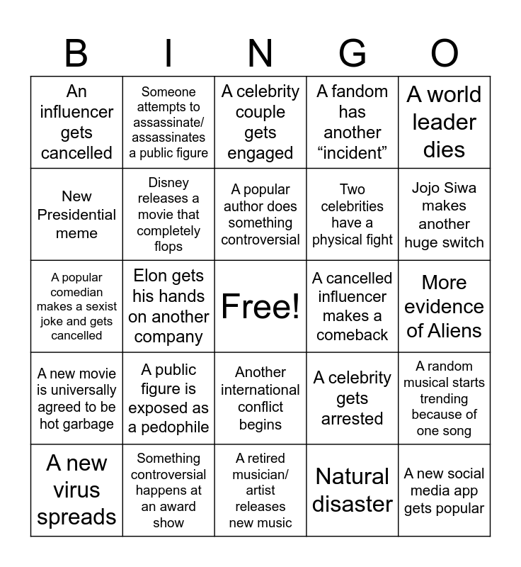 This bingo card has a free space and 24 words: A public figure is exposed as a pedophile, Something controversial happens at an award show, A popular author does something controversial, A new virus spreads, A world leader dies, An influencer gets cancelled, New Presidential meme, Someone attempts to assassinate/ assassinates a public figure, A cancelled influencer makes a comeback, Another international conflict begins, Two celebrities have a physical fight, A popular comedian makes a sexist joke and gets cancelled, A celebrity gets arrested, A random musical starts trending because of one song, Disney releases a movie that completely flops, Natural disaster, More evidence of Aliens, A celebrity couple gets engaged, Jojo Siwa makes another huge switch, Elon gets his hands on another company, A new social media app gets popular, A new movie is universally agreed to be hot garbage, A fandom has another “incident” and A retired musician/ artist releases new music.