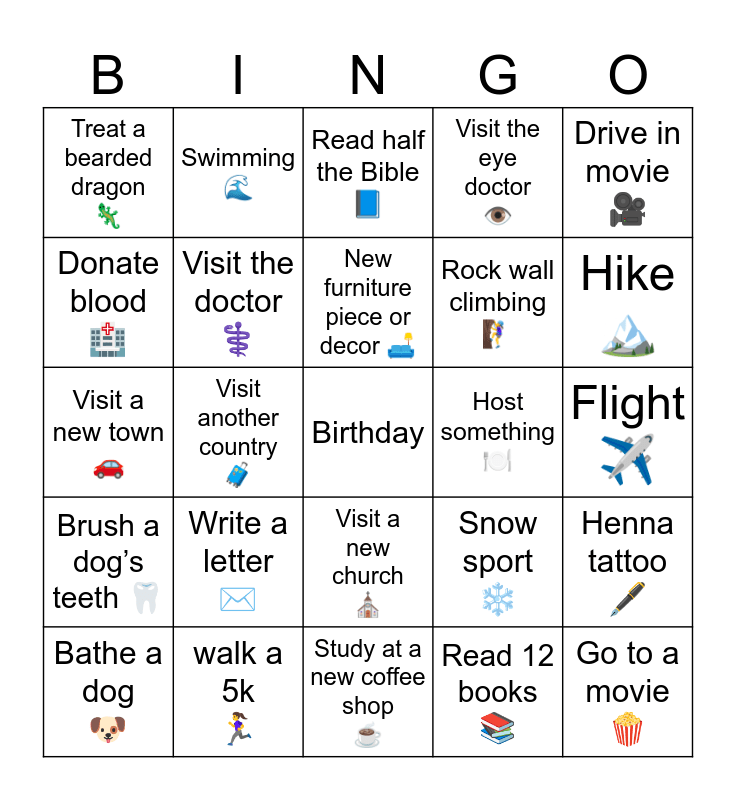 This bingo card has a free space and 24 words: Write a letter ✉️, walk a 5k 🏃♀️, New furniture piece or decor 🛋️, Bathe a dog 🐶, Drive in movie 🎥, Treat a bearded dragon 🦎, Donate blood 🏥, Swimming 🌊, Host something 🍽️, Visit a new church ⛪️, Rock wall climbing 🧗♀️, Visit a new town 🚗, Snow sport ❄️, Henna tattoo 🖋️, Visit the doctor ⚕️, Read 12 books 📚, Flight ✈️, Read half the Bible 📘, Hike 🏔️, Visit another country 🧳, Go to a movie 🍿, Brush a dog’s teeth 🦷, Visit the eye doctor 👁️ and Study at a new coffee shop ☕️.