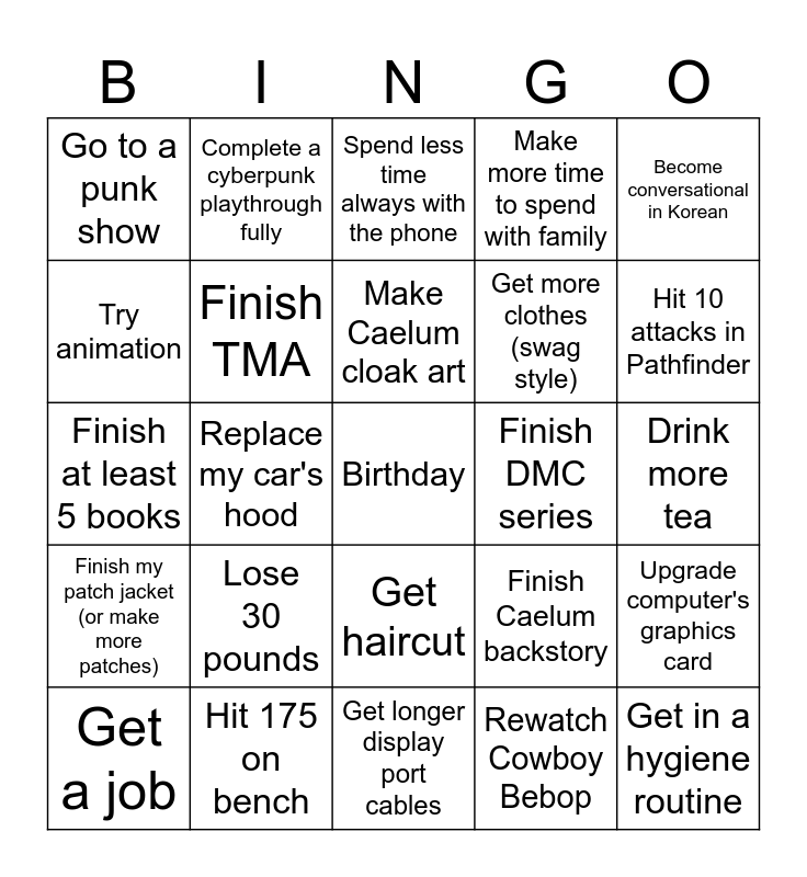 This bingo card has a free space and 24 words: Lose 30 pounds, Hit 175 on bench, Make Caelum cloak art, Get a job, Become conversational in Korean, Go to a punk show, Try animation, Complete a cyberpunk playthrough fully, Finish DMC series, Get haircut, Get more clothes (swag style), Finish at least 5 books, Finish Caelum backstory, Upgrade computer's graphics card, Finish TMA, Rewatch Cowboy Bebop, Drink more tea, Spend less time always with the phone, Hit 10 attacks in Pathfinder, Replace my car's hood, Get in a hygiene routine, Finish my patch jacket (or make more patches), Make more time to spend with family and Get longer display port cables.