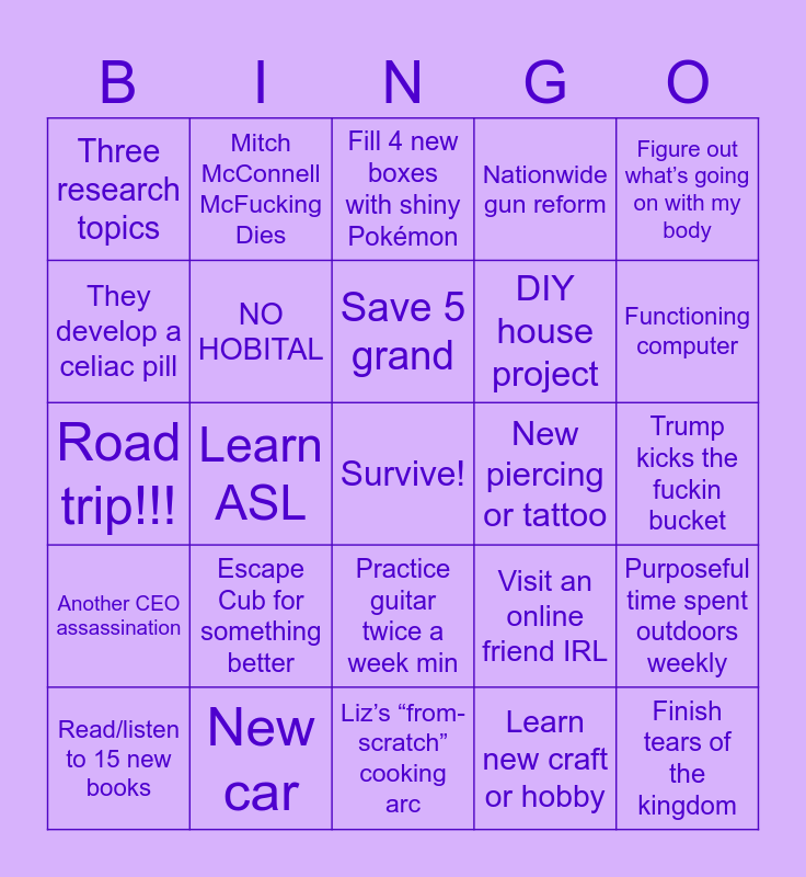 This bingo card has a free space and 24 words: Escape Cub for something better, New car, Save 5 grand, Read/listen to 15 new books, Figure out what’s going on with my body, Three research topics, They develop a celiac pill, Mitch McConnell McFucking Dies, New piercing or tattoo, Practice guitar twice a week min, DIY house project, Road trip!!!, Visit an online friend IRL, Purposeful time spent outdoors weekly, NO HOBITAL, Learn new craft or hobby, Trump kicks the fuckin bucket, Fill 4 new boxes with shiny Pokémon, Functioning computer, Learn ASL, Finish tears of the kingdom, Another CEO assassination, Nationwide gun reform and Liz’s “from-scratch” cooking arc.