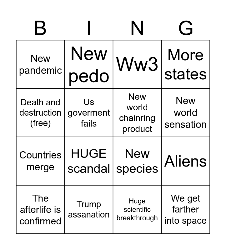 This bingo card has 16 words: Trump assanation, Aliens, Ww3, New pandemic, Countries merge, New pedo, New species, Huge scientific breakthrough, Death and destruction (free), Us goverment fails, The afterlife is confirmed, More states, HUGE scandal, New world sensation, New world chainring product and We get farther into space.