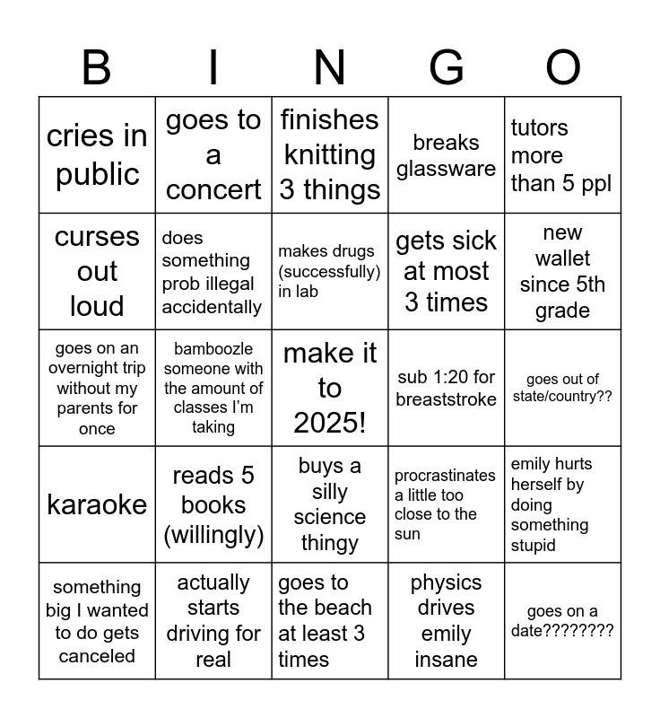 This bingo card has a free space and 24 words: reads 5 books (willingly), actually starts driving for real, makes drugs (successfully) in lab, something big I wanted to do gets canceled, tutors more than 5 ppl, cries in public, curses out loud, goes to a concert, sub 1:20 for breaststroke, buys a silly science thingy, gets sick at most 3 times, goes on an overnight trip without my parents for once, procrastinates a little too close to the sun, emily hurts herself by doing something stupid, does something prob illegal accidentally, physics drives emily insane, goes out of state/country??, finishes knitting 3 things, new wallet since 5th grade, bamboozle someone with the amount of classes I’m taking, goes on a date????????, karaoke, breaks glassware and goes to the beach at least 3 times.