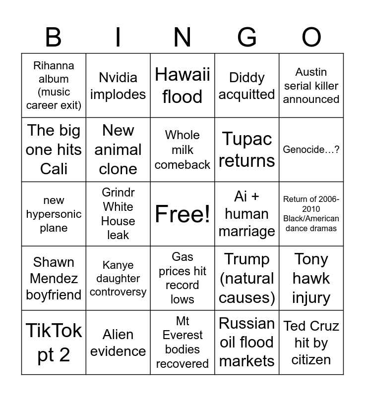 This bingo card has a free space and 24 words: Kanye daughter controversy, Alien evidence, Whole milk comeback, TikTok pt 2, Austin serial killer announced, Rihanna album (music career exit), The big one hits Cali, Nvidia implodes, Ai + human marriage, Gas prices hit record lows, Tupac returns, new hypersonic plane, Trump (natural causes), Tony hawk injury, New animal clone, Russian oil flood markets, Return of 2006-2010 Black/American dance dramas, Hawaii flood, Genocide…?, Grindr White House leak, Ted Cruz hit by citizen, Shawn Mendez boyfriend, Diddy acquitted and Mt Everest bodies recovered.