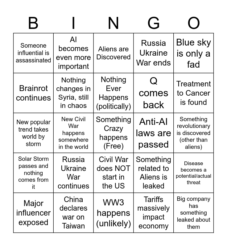This bingo card has a free space and 24 words: Russia Ukraine War continues, China declares war on Taiwan, Nothing Ever Happens (politically), Major influencer exposed, Blue sky is only a fad, Someone influential is assassinated, Brainrot continues, AI becomes even more important, Anti-AI laws are passed, Civil War does NOT start in the US, Q comes back, New popular trend takes world by storm, Something related to Aliens is leaked, Disease becomes a potential/actual threat, Nothing changes in Syria, still in chaos, Tariffs massively impact economy, Something revolutionary is discovered (other than aliens), Aliens are Discovered, Treatment to Cancer is found, New Civil War happens somewhere in the world, Big company has something leaked about them, Solar Storm passes and nothing comes from it, Russia Ukraine War ends and WW3 happens (unlikely).