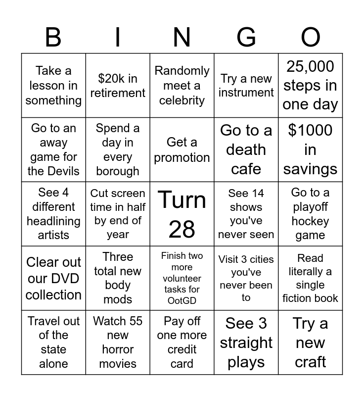 This bingo card has a free space and 24 words: Three total new body mods, Watch 55 new horror movies, Get a promotion, Travel out of the state alone, 25,000 steps in one day, Take a lesson in something, Go to an away game for the Devils, $20k in retirement, See 14 shows you've never seen, Finish two more volunteer tasks for OotGD, Go to a death cafe, See 4 different headlining artists, Visit 3 cities you've never been to, Read literally a single fiction book, Spend a day in every borough, See 3 straight plays, Go to a playoff hockey game, Randomly meet a celebrity, $1000 in savings, Cut screen time in half by end of year, Try a new craft, Clear out our DVD collection, Try a new instrument and Pay off one more credit card.