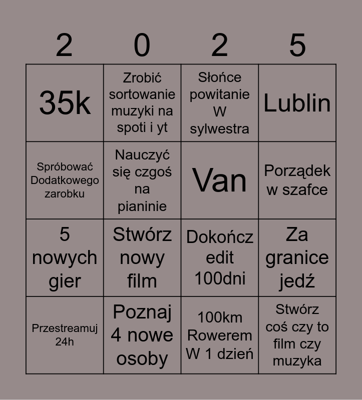 This bingo card has 17 words: 100km Rowerem W 1 dzień, Przestreamuj 24h, Słońce powitanie W sylwestra, 35k, Stwórz nowy film, Lublin, Za granice jedź, Van, Porządek w szafce, Nauczyć się czgoś na pianinie, Poznaj 4 nowe osoby, Dokończ edit 100dni, Spróbować Dodatkowego zarobku, Zrobić sortowanie muzyki na spoti i yt, 5 nowych gier, Obejrzyć 10 nowych filmów and Stwórz coś czy to film czy muzyka.