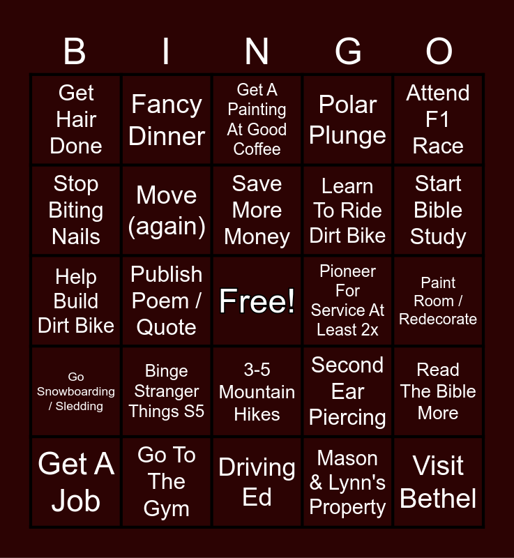 This bingo card has a free space and 24 words: Binge Stranger Things S5, Go To The Gym, Save More Money, Get A Job, Attend F1 Race, Get Hair Done, Stop Biting Nails, Fancy Dinner, Pioneer For Service At Least 2x, 3-5 Mountain Hikes, Learn To Ride Dirt Bike, Help Build Dirt Bike, Second Ear Piercing, Read The Bible More, Move (again), Mason & Lynn's Property, Paint Room / Redecorate, Get A Painting At Good Coffee, Start Bible Study, Publish Poem / Quote, Visit Bethel, Go Snowboarding / Sledding, Polar Plunge and Driving Ed.