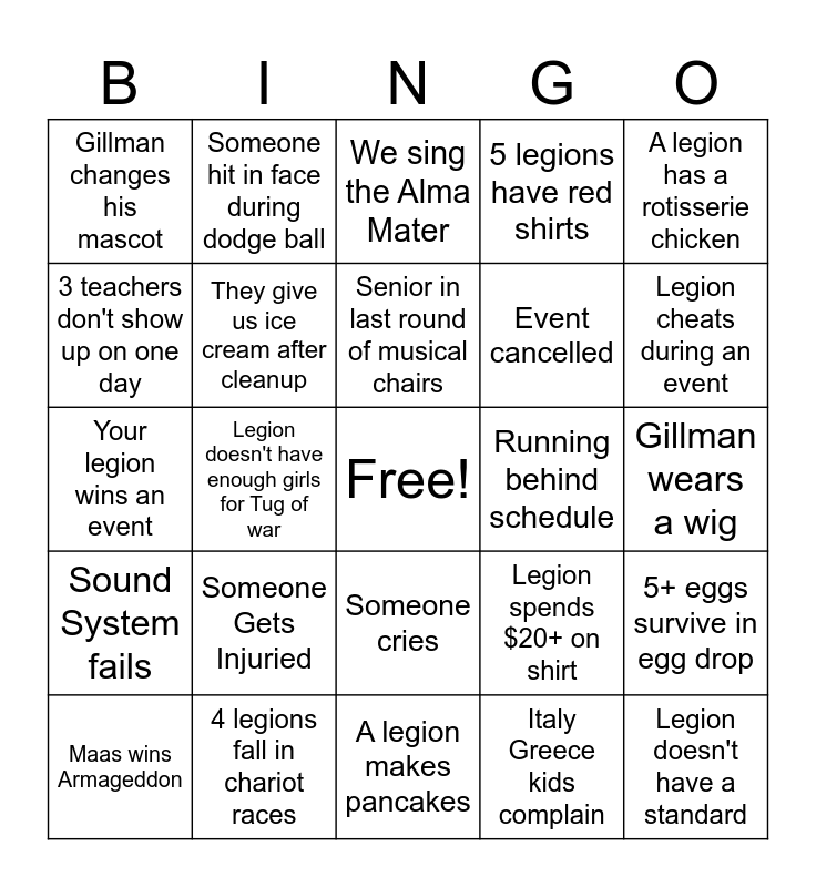 This bingo card has a free space and 24 words: Someone Gets Injuried, 4 legions fall in chariot races, Senior in last round of musical chairs, Maas wins Armageddon, A legion has a rotisserie chicken, Gillman changes his mascot, 3 teachers don't show up on one day, Someone hit in face during dodge ball, Running behind schedule, Someone cries, Event cancelled, Your legion wins an event, Legion spends $20+ on shirt, 5+ eggs survive in egg drop, They give us ice cream after cleanup, Italy Greece kids complain, Gillman wears a wig, We sing the Alma Mater, Legion cheats during an event, Legion doesn't have enough girls for Tug of war, Legion doesn't have a standard, Sound System fails, 5 legions have red shirts and A legion makes pancakes.