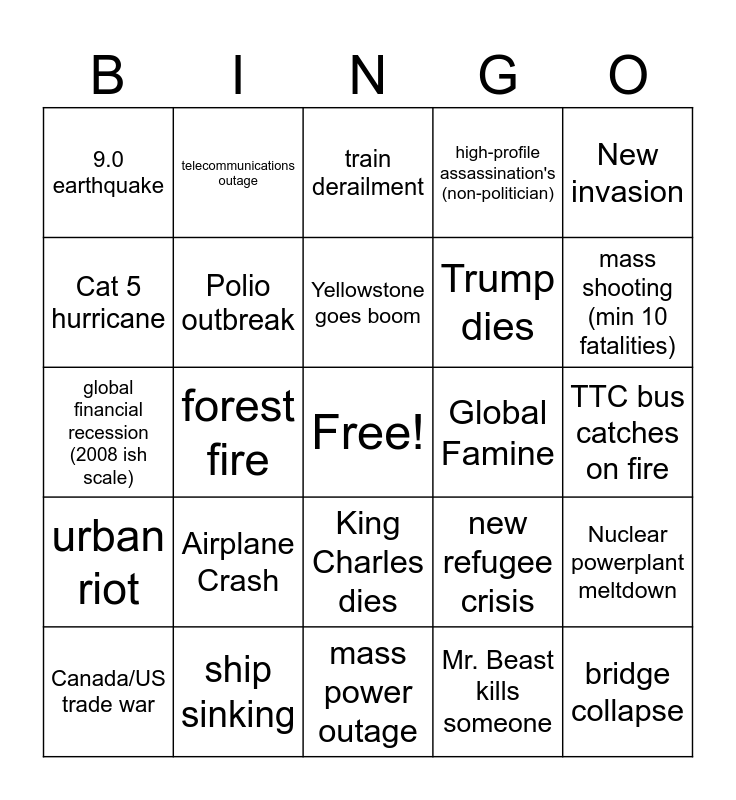 This bingo card has a free space and 24 words: Airplane Crash, ship sinking, Yellowstone goes boom, Canada/US trade war, New invasion, 9.0 earthquake, Cat 5 hurricane, telecommunications outage, Global Famine, King Charles dies, Trump dies, global financial recession (2008 ish scale), new refugee crisis, Nuclear powerplant meltdown, Polio outbreak, Mr. Beast kills someone, TTC bus catches on fire, train derailment, mass shooting (min 10 fatalities), forest fire, bridge collapse, urban riot, high-profile assassination's (non-politician) and mass power outage.