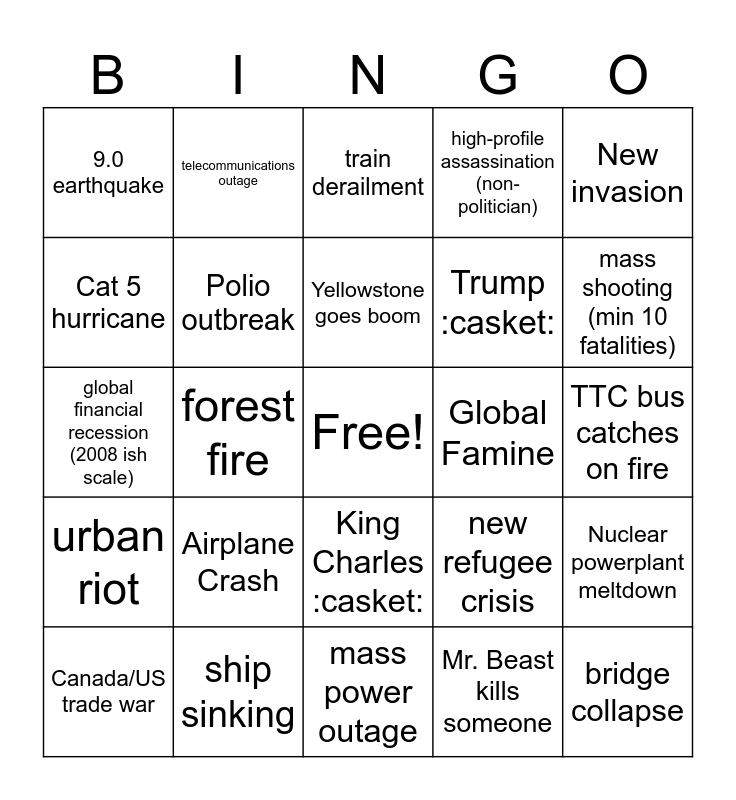 This bingo card has a free space and 24 words: Airplane Crash, ship sinking, Yellowstone goes boom, Canada/US trade war, New invasion, 9.0 earthquake, Cat 5 hurricane, telecommunications outage, Global Famine, King Charles :casket:, Trump :casket:, global financial recession (2008 ish scale), new refugee crisis, Nuclear powerplant meltdown, Polio outbreak, Mr. Beast kills someone, TTC bus catches on fire, train derailment, mass shooting (min 10 fatalities), forest fire, bridge collapse, urban riot, high-profile assassination (non-politician) and mass power outage.