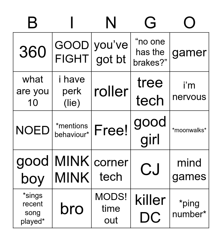 This bingo card has a free space and 24 words: MINK MINK, bro, roller, *sings recent song played*, gamer, 360, what are you 10, GOOD FIGHT, good girl, corner tech, tree tech, NOED, CJ, mind games, i have perk (lie), killer DC, *moonwalks*, you’ve got bt, i’m nervous, *mentions behaviour*, *ping number*, good boy, “no one has the brakes?” and MODS! time out.