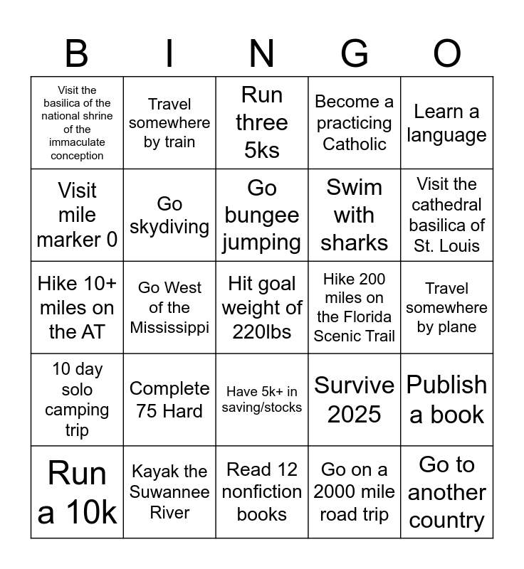This bingo card has 25 words: Complete 75 Hard, Read 12 nonfiction books, Go bungee jumping, Run a 10k, Learn a language, Visit the basilica of the national shrine of the immaculate conception, Visit mile marker 0, Travel somewhere by train, Hike 200 miles on the Florida Scenic Trail, Have 5k+ in saving/stocks, Swim with sharks, Hike 10+ miles on the AT, Survive 2025, Publish a book, Go skydiving, Go to another country, Travel somewhere by plane, Run three 5ks, Visit the cathedral basilica of St. Louis, Go West of the Mississippi, Hit goal weight of 220lbs, Kayak the Suwannee River, 10 day solo camping trip, Become a practicing Catholic and Go on a 2000 mile road trip.
