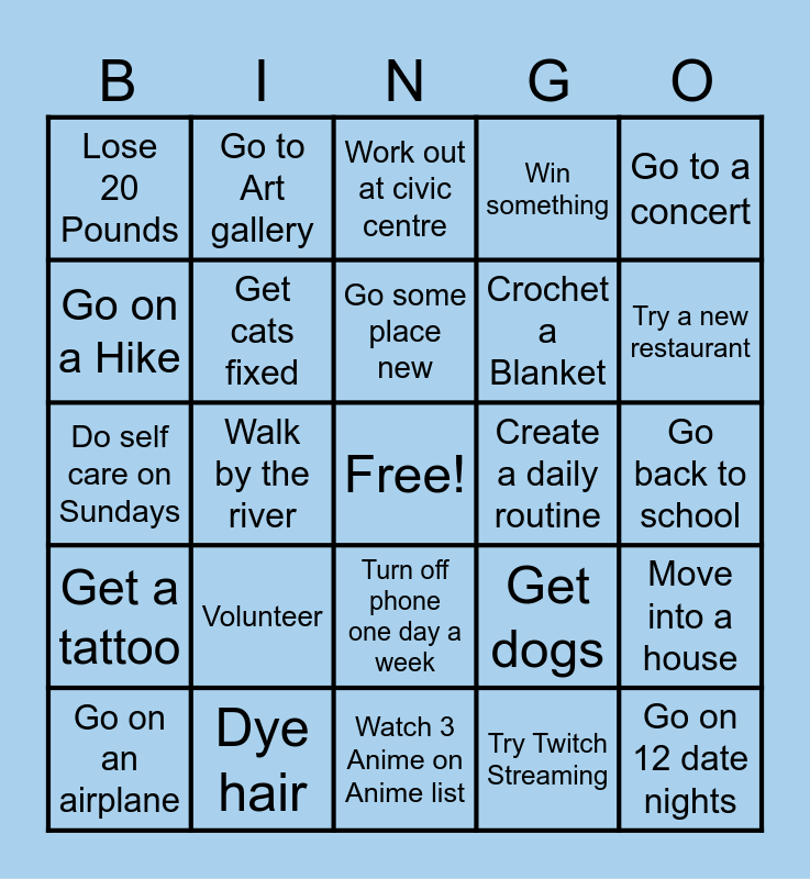 This bingo card has a free space and 25 words: Volunteer, Watch 3 Anime on Anime list, Go some place new, Go on an airplane, Go to a concert, Lose 20 Pounds, Go on a Hike, Go to Art gallery, Create a daily routine, Turn off phone one day a week, Crochet a Blanket, Do self care on Sundays, Get dogs, Move into a house, Get cats fixed, Go to Prince George, Go back to school, Work out at civic centre, Try a new restaurant, Walk by the river, Go on 12 date nights, Dye hair, Get a tattoo, Win something and Try Twitch Streaming.