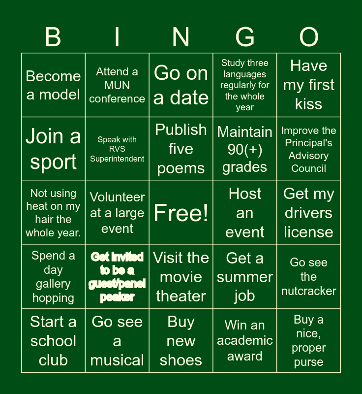 This bingo card has a free space and 24 words: Get invited to be a guest/panel peaker, Go see a musical, Publish five poems, Start a school club, Have my first kiss, Become a model, Join a sport, Attend a MUN conference, Host an event, Visit the movie theater, Maintain 90(+) grades, Not using heat on my hair the whole year., Get a summer job, Go see the nutcracker, Speak with RVS Superintendent, Win an academic award, Get my drivers license, Go on a date, Improve the Principal's Advisory Council, Volunteer at a large event, Buy a nice, proper purse, Spend a day gallery hopping, Study three languages regularly for the whole year and Buy new shoes.