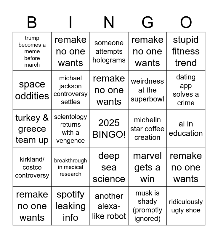 This bingo card has a free space and 29 words: remake no one wants, weed debate pt 2, scientology returns with a vengence, old man game becomes cool, trump becomes a meme before march, someone attempts holograms, michael jackson controversy settles, breakthrough in medical research, michelin star coffee creation, spotify leaking info, ai in education, ridiculously ugly shoe, another alexa-like robot, musk is shady (promptly ignored), dating app solves a crime, y2k celebrity goes to jail, deep sea science, kirkland/ costco controversy, stupid fitness trend, turkey & greece team up, marvel gets a win, teenagers in politics, weirdness at the superbowl, space oddities, remake no one wants, remake no one wants, remake no one wants, remake no one wants and remake no one wants.