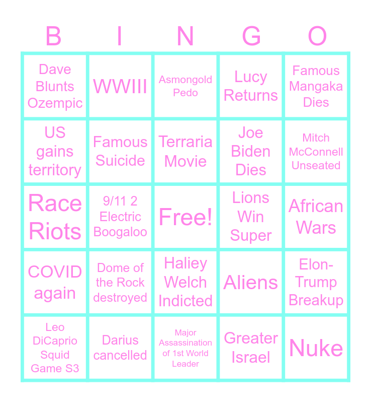 This bingo card has a free space and 24 words: Dome of the Rock destroyed, Darius cancelled, Terraria Movie, Leo DiCaprio Squid Game S3, Famous Mangaka Dies, Dave Blunts Ozempic, US gains territory, WWIII, Lions Win Super, Haliey Welch Indicted, Joe Biden Dies, Race Riots, Aliens, Elon-Trump Breakup, Famous Suicide, Greater Israel, African Wars, Asmongold Pedo, Mitch McConnell Unseated, 9/11 2 Electric Boogaloo, Nuke, COVID again, Lucy Returns and Major Assassination of 1st World Leader.