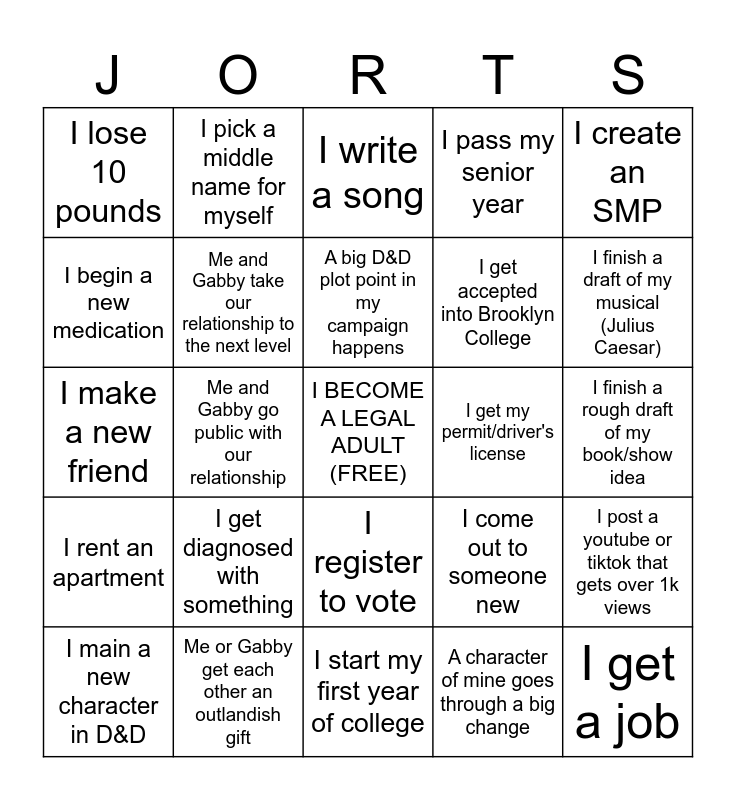 This bingo card has a free space and 24 words: I get diagnosed with something, Me or Gabby get each other an outlandish gift, A big D&D plot point in my campaign happens, I main a new character in D&D, I create an SMP, I lose 10 pounds, I begin a new medication, I pick a middle name for myself, I get my permit/driver's license, I register to vote, I get accepted into Brooklyn College, I make a new friend, I come out to someone new, I post a youtube or tiktok that gets over 1k views, Me and Gabby take our relationship to the next level, A character of mine goes through a big change, I finish a rough draft of my book/show idea, I write a song, I finish a draft of my musical (Julius Caesar), Me and Gabby go public with our relationship, I get a job, I rent an apartment, I pass my senior year and I start my first year of college.