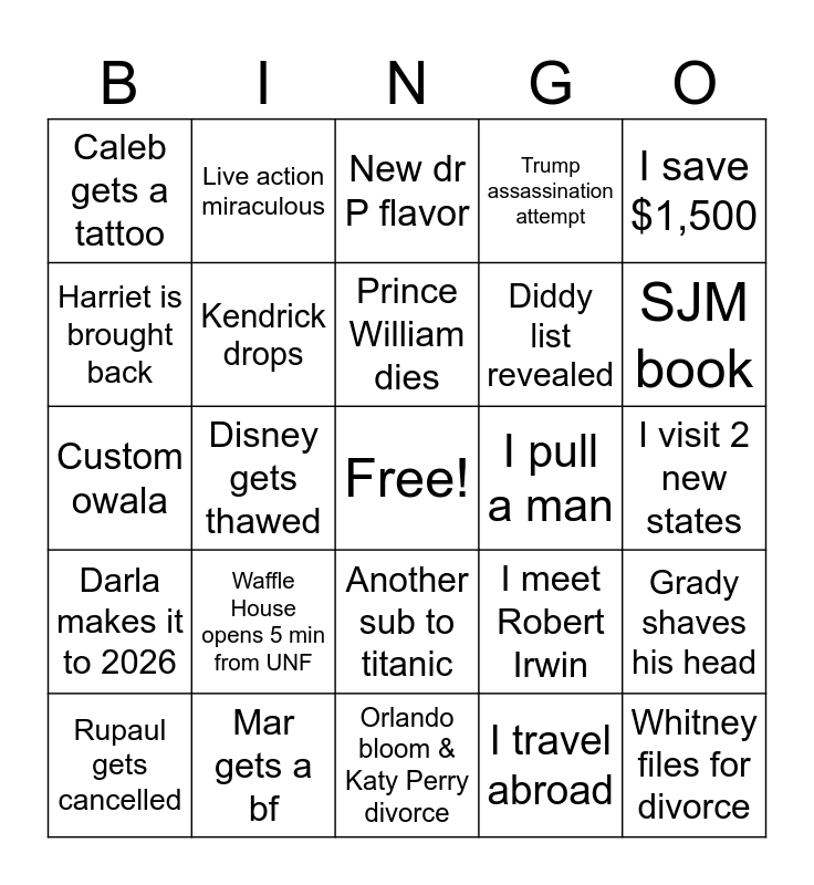 This bingo card has a free space and 24 words: Waffle House opens 5 min from UNF, Mar gets a bf, Prince William dies, Rupaul gets cancelled, I save $1,500, Caleb gets a tattoo, Harriet is brought back, Live action miraculous, I pull a man, Another sub to titanic, Diddy list revealed, Custom owala, I meet Robert Irwin, Grady shaves his head, Kendrick drops, I travel abroad, I visit 2 new states, New dr P flavor, SJM book, Disney gets thawed, Whitney files for divorce, Darla makes it to 2026, Trump assassination attempt and Orlando bloom & Katy Perry divorce.