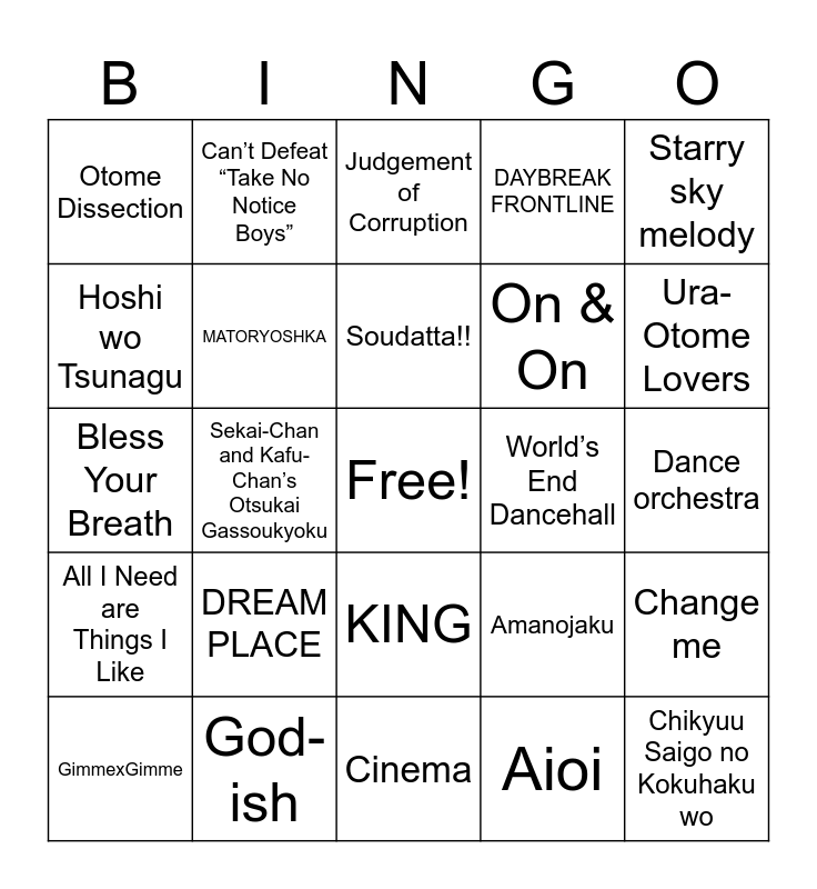 This bingo card has a free space and 395 words: Tell Your World, Teo, HIBANA Reloaded, Happy Synthesizer, Nostalogic, Charles, BRING IT ON, Doctor=Funk Beat, BURIKI NO DANCE, Sweet Magic, NEXT NEST, Melt, THE END OF HATSUNE MIKU, Blessing, The World Hasn’t Even Started Yet, Ready Steady, Newly Edgy Idols, Composing the Future, NeedLe, Hello/How Are You?, Jishoumushoku, Fragile, Patchwork Stacatto, SEKAI, Wah Wah World, Your Adventure Log Has Vanished!, ROKI, alive, Night Sky Patrol of Tomorrow, Near, Just Be Friends, Law-Evading Rock, Hated by Life, The World is Mine, Stella, Miracle Paint, Jackpot Sad Girl, Hand in Hand, Yabanashi Deceive, GimmexGimme, Viva Happy, junky nighttown orchestra, Dance Robot Dance, on the rocks, Cellphone Love Story, Miku, 39Music!, Aoku Kakero!, Leia - Remind, Melty Land Nightmare, Greenlights Serenade, Becoming Potatoes, ECHO, Senbonzakura, Dramaturgy, Rollin Girl, Hitorinbo Envy, *Hello, Planet, Love Trial, Forward, Totemoitai Itagaritai, Hibikase, Chururira Chururira Daddadda!, Bless Your Breath, Tale of the Deep-sea Lily, ODDS&ENDS, Otome Dissection, The Intense Voice of Hatsune Miku, MORE! JUMP! MORE!, Ura-Otome Lovers, Unknown Mother-Goose, World’s End Dancehall, Time Machine, NIJIIRO STORIES, drop pop candy, Bocca della Verita, Brand New Day, Awaiting Clear Skies, Milk Crown on Sonechka, Positive☆Dance Time, Color of Drops, RAD DOGS, Miku Miku Ni Shiteageru, Ifuudoudou, Because You’re Here, from Y to Y, Close to gray, once upon a dream, Do Not Go, KING, Singing of a flower, Angel’s Clover, As You Like It, dreamin chuchu, IDSMILE, 「1」, Into The Night, Cinema, Ghost City Tokyo, Love material, Romeo & Cinderella, Copycat, Tondemo-Wonderz, Kanadetomosusora, The Bubble Future, Traffic jam, From Tokyo, Beat Eater, Chikyuu Saigo no Kokuhaku wo, Six Trillion Years and Overnight Story, Bitter Choco Decoration, Soudatta!!, Kagerou Daze, icedrop, Glory Steady Go!, Children Record, Highlight, magic number, Pulse of the Meteor, Cutlery, Reborn, Gunjo Sanka, Roshin Yuukai (meltdown), Lost One’s Weeping, MACHINEGUN POEM DOLL, Venom, Hailey Doppelganger, Telecaster b boy, TOKIO FUNKA, Devil’s Manner, I want to be your heart, Marshmary, Butterfly on Your Right Shoulder, ray, Hello, World!, Sick of House!, Showtime Ruler, Lower one’s eyes, Happy Halloween, Hatsune Creation Myth, Alter Ego, STAGE OF SEKAI, Karakuri Pierrot, Awake Now, Worldwide Wander, The Daughter of Evil, The Servant of Evil, Waltz of the Deceased, Music Like Magic!, Last Score, fixer, Mirai, Ghost Rule, villain, Cendrillon 10th anniversary, Shoujo Rei, Airhead, End Mark ni Kibou to Namida wo soete, The EmpErroR, Don’t Fight The Music, Theme of Niccori^^ Survey Team, Tricologe, Heartbeat#0822, Usseewa, Luka Luka★Night Fever, Goodbye, Odo, Colorful Marine Snow, Love Me, Love Me, Love Me, Sharing The World, Flyer, Peaky Peaky, Judas, Literary nonsense, Heart Forecast, We’re Still Underground, Blue Star, Metamo Re:born, 1,2, FanClub, Rain and Petra, MATORYOSHKA, DONUT HOLE, DUNE, Nomad, Thousand Year Solo, Piano x Forte x Scandal, Decade, 88☆彡, ONESELF, PaIII.SENSATION, DarlingDance, Made to Order, Identity, blue paint, Cosmospice, Tokugawa Cupnoodle Prohibition, Salamander, IF, DSCF, Black★Rock Shooter, Moonlight, Remote Control, At God’s Mercy, Aun no Beats, Wonder Style, bug, Goodbye Declaration, The Vampire, Brain Fluid Explosion Girl, UNDERWATER, Starry sky melody, Our 16bit Wars, Meru, Alien Alien, Incomplete Anthem, City, SHOW OFF, sweety glitch, Fräulein=библиотека, Hurray, Dance orchestra, Parasol Cider, Lost and Found, YY, Even so, It’s OK, Kimi no Yoru Wo Kure, Blue Planet, FUTURE EVE, Voices, Gehenna, Calc., Hollow, Hello Builder, Journey, Amanojaku, Unhappy Refrain, phony, Double Lariat, Invisible, Ego rock, Bad ∞ End ∞ Night, Torinokocity, This is the Happiness and Peace of Mind Committee, DAYBREAK FRONTLINE, AMARA, DREAM PLACE, Unsung Melodies, Bloom in mud, Ichi Ni no San de, Change me, Love Ka?, paradichlorobenzene, imaginary love story, Stardust Utopia, the WALL, I am you, AttaKAITO, Float Planner, Imperial Girl, Non-breath oblige, Twilight Melody, Lonely Universe, Hidamari no Setsuna, What’s up? Pop!, Kashika, Kusare-gedou and Chocolate, Ten Thousand Stars, yomosugara kimi omou, ONLINE GAME ADDICTS SPRECHCHOR, Cantarella, FREELY TOMORROW, Kimagure Mercy, Sorega Anata No Shiawase To Shitemo, Rin-chan Now!, Pheles, Dawn and Fireflies, Hoshizora Orchestra, Flyway, p.h., Sekai-Chan and Kafu-Chan’s Otsukai Gassoukyoku, Intergalactic Bound, Tenshi no Tsubasa, Evil Food Eater Conchita, Gift from the Princess who Brought Sleep, The Tailor of Enbizaka, Judgement of Corruption, Snowmix♪, Rainy Snowdrop, Irony, We are, One Sheep, 1925, Hello, Worker, Where shall we go?, Can’t Make A Song!!, kokoro, YAMINABE!!!!, STROBE LAST, My Palette is Full of You, Q, 39, Mr. Showtime, Booo!, EGOIST, Epilogue without you, Attract Light, MikuFiesta, Samsa, TRASH and TRASH!, Vampire’s ∞ pathoS, Be The MUSIC!, METEOR, Interviewer, My love is Hellfire, Snowman, Shinkai Shoujo, Aioi, Namonaki Kakumei, OKOCHAMA SENSO, Uninterrupted Indigo, The peachy key, kitty, Good Weather, It’s just life, Setsuna Trip, SHANTI, Eternal Aria, Coral, JINSEI [Our Life], Retainer Supplanting His Lord, Ah, It’s a Wonderful Cat Life, Stardust Medley, Teammates, glow, It was a very nice June, Kyu-kurarin, Afterglow, Solar System Disco, Shinpaku Pairing, Engeki, Hoshi wo Tsunagu, Brain Revolution Girl, Thousand Little Voices, We are the Stain Busters!, shinjinrui, Zunda Party Night, Disco No.39, Summertime Record, Realize, Kirapipi☆Kirapika, Bottle Cake, kokoronashi, Plaything, HERO, CIRCUS PANIC!!!, The Snow White Princess is, Un-lock, Lucky☆Orb, FAKE HEART, NEO, I’m Mine, Tengaku, manimani, Melancholic, Becoming Pigs Yeah Yeah, Love is War, (Not) A Devil, All I Need are Things I Like, TSUGAIKOGARASHI, CRAZY, God-ish, Dear, Cool Me Down, Kiss the Villain, Selfish pr