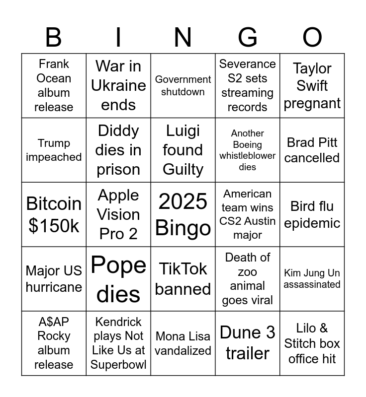 This bingo card has a free space and 24 words: Pope dies, Kendrick plays Not Like Us at Superbowl, Luigi found Guilty, A$AP Rocky album release, Taylor Swift pregnant, Frank Ocean album release, Trump impeached, War in Ukraine ends, American team wins CS2 Austin major, TikTok banned, Another Boeing whistleblower dies, Bitcoin $150k, Death of zoo animal goes viral, Kim Jung Un assassinated, Diddy dies in prison, Dune 3 trailer, Bird flu epidemic, Government shutdown, Brad Pitt cancelled, Apple Vision Pro 2, Lilo & Stitch box office hit, Major US hurricane, Severance S2 sets streaming records and Mona Lisa vandalized.