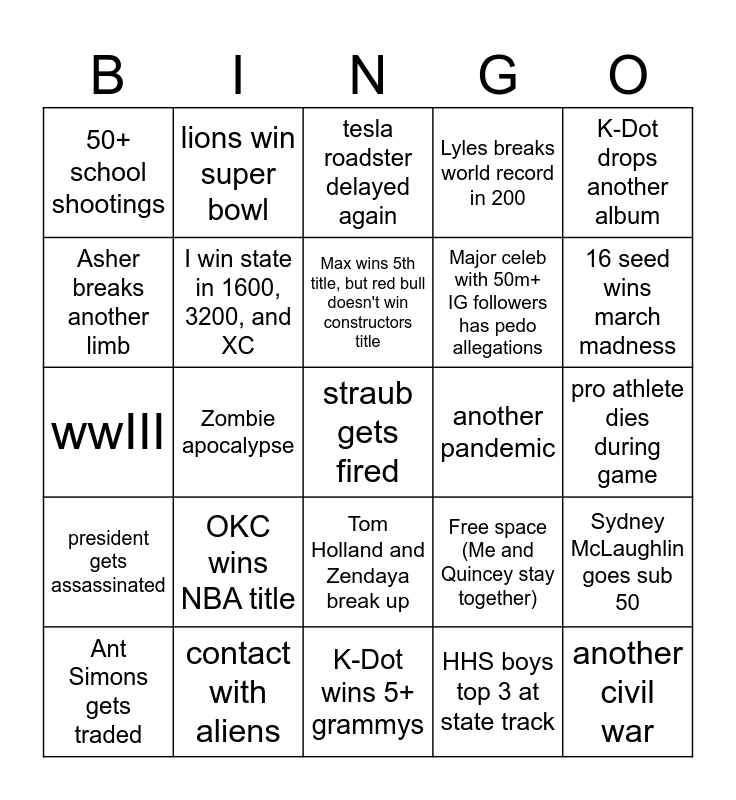 This bingo card has 25 words: OKC wins NBA title, K-Dot wins 5+ grammys, Max wins 5th title, but red bull doesn't win constructors title, Ant Simons gets traded, K-Dot drops another album, 50+ school shootings, Asher breaks another limb, lions win super bowl, another pandemic, Tom Holland and Zendaya break up, Major celeb with 50m+ IG followers has pedo allegations, wwIII, Free space (Me and Quincey stay together), Sydney McLaughlin goes sub 50, I win state in 1600, 3200, and XC, another civil war, pro athlete dies during game, tesla roadster delayed again, 16 seed wins march madness, Zombie apocalypse, straub gets fired, contact with aliens, president gets assassinated, Lyles breaks world record in 200 and HHS boys top 3 at state track.
