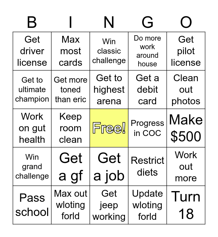 This bingo card has a free space and 24 words: Get a gf, Max out wloting forld, Get to highest arena, Pass school, Get pilot license, Get driver license, Get to ultimate champion, Max most cards, Progress in COC, Get a job, Get a debit card, Work on gut health, Restrict diets, Work out more, Get more toned than eric, Update wloting forld, Make $500, Win classic challenge, Clean out photos, Keep room clean, Turn 18, Win grand challenge, Do more work around house and Get jeep working.