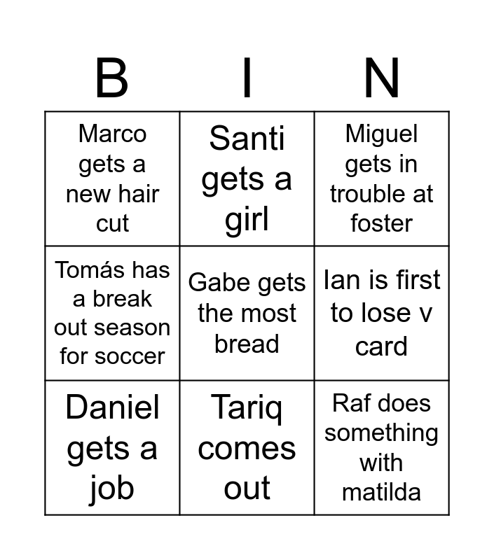 This bingo card has a free space and 8 words: Ian is first to lose v card, Miguel gets in trouble at foster, Santi gets a girl, Daniel gets a job, Marco gets a new hair cut, Raf does something with matilda, Tomás has a break out season for soccer and Tariq comes out.
